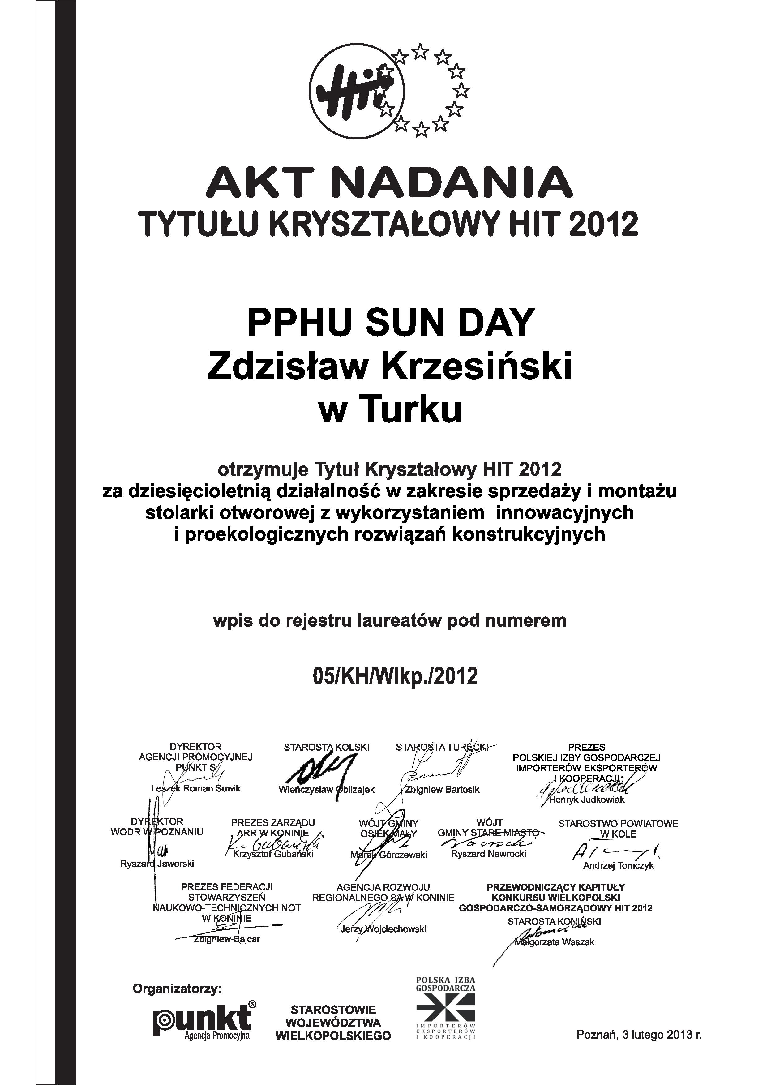 W niedzielę 3 lutego 2013r. aula Uniwersytetu Adama Mickiewicza w Poznaniu wypełniła się przedsiębiorcami i przedstawicielami rozmaitych wielkopolskich instytucji. W czasie Gali Konkursu Gospodarczo-Samorządowy HIT Regionu otrzymaliśmy nagrodę "Kryształowego HITa 2012" za dziesięcioletnią działalność w zakresie sprzedaży i montażu stolarki otworowej, z wykorzystaniem innowacyjnych i proekologicznych rozwiązań konstrukcyjnych.